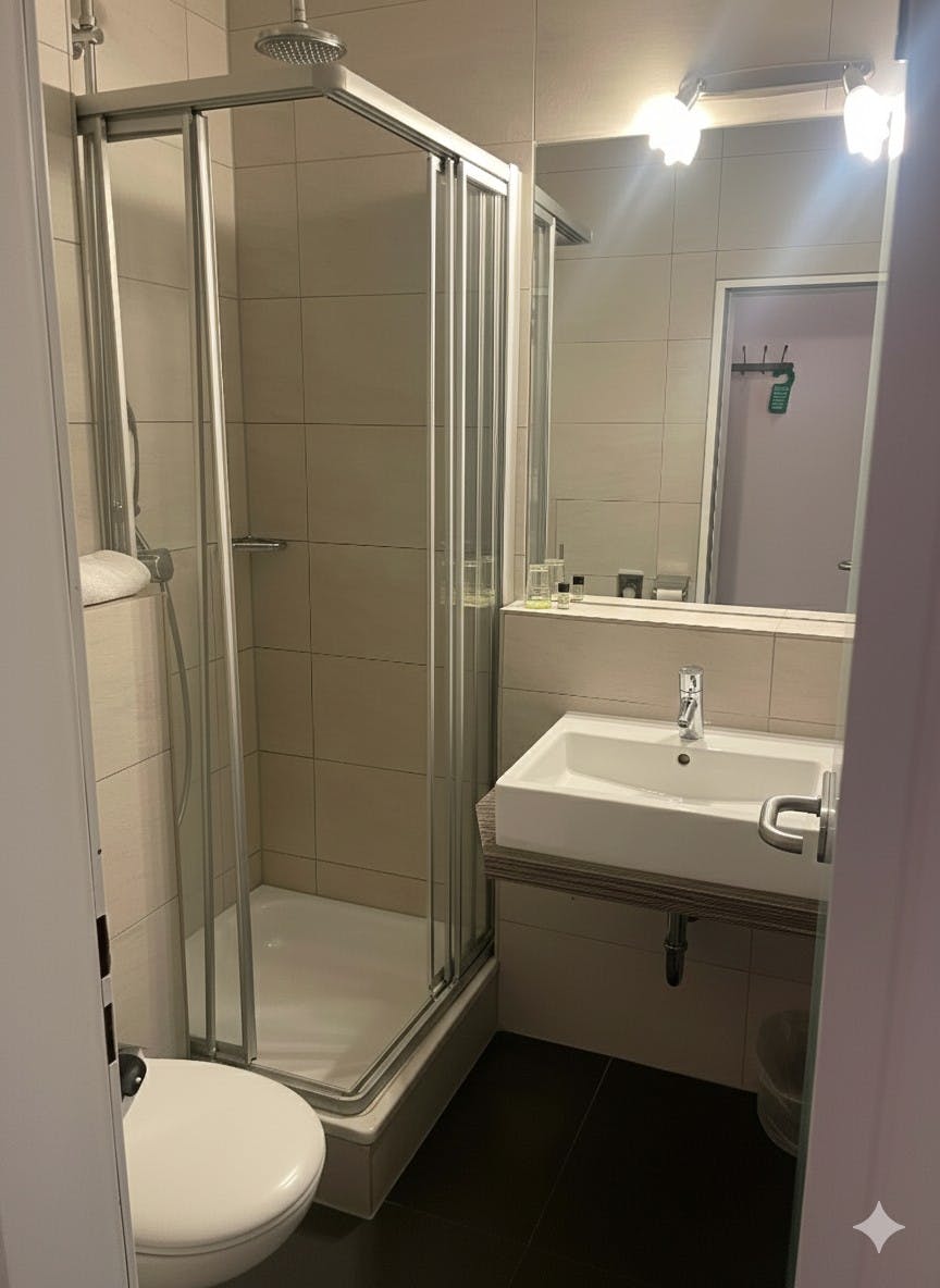 The double room has two single beds, a desk, a TV and a wardrobe. There is an integrated bathroom with shower and WC. Free W-LAN is available for guests. A free car park at the hotel is also included.