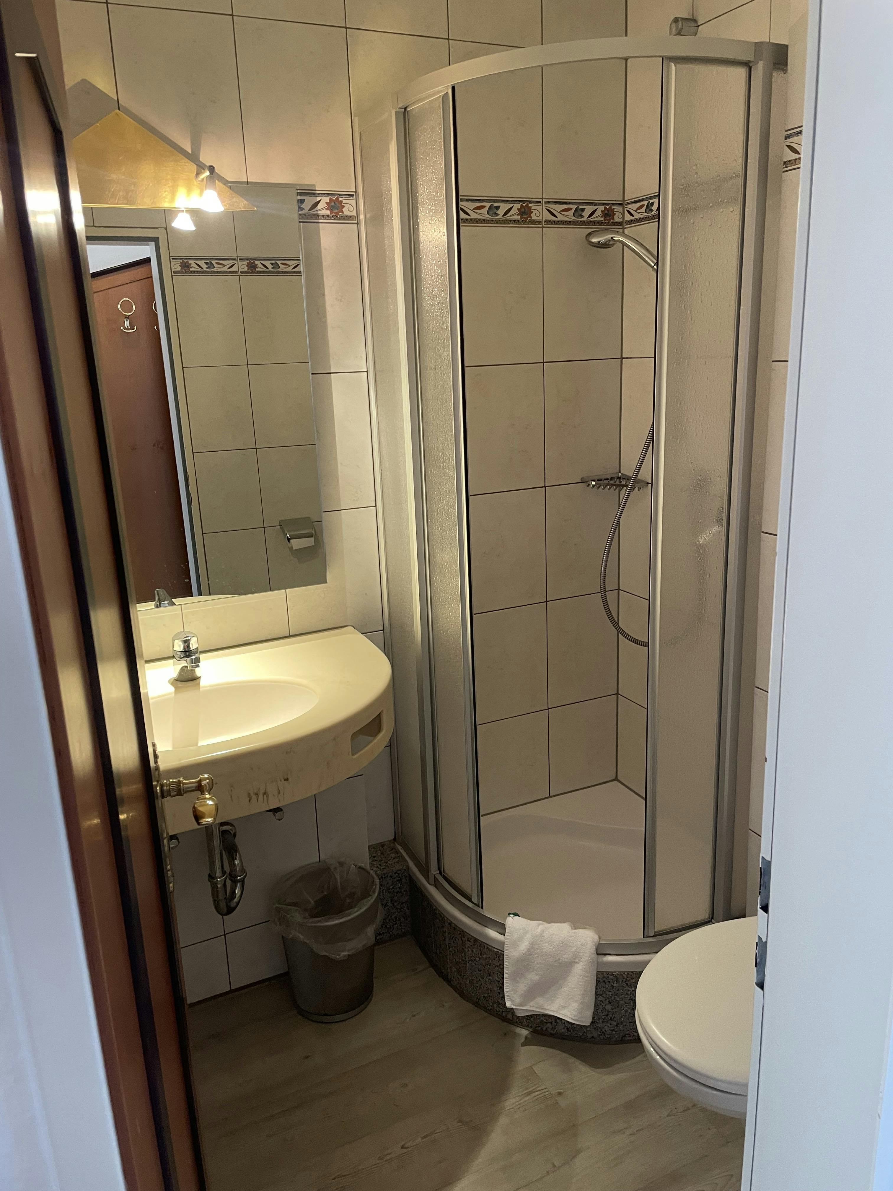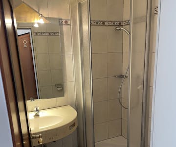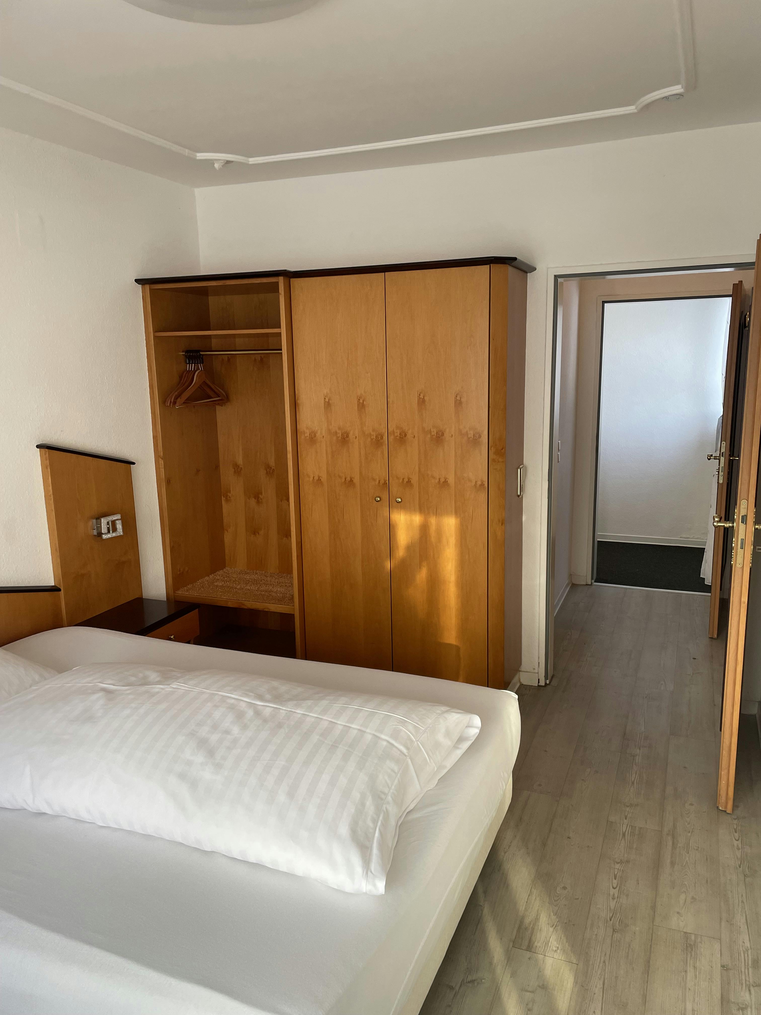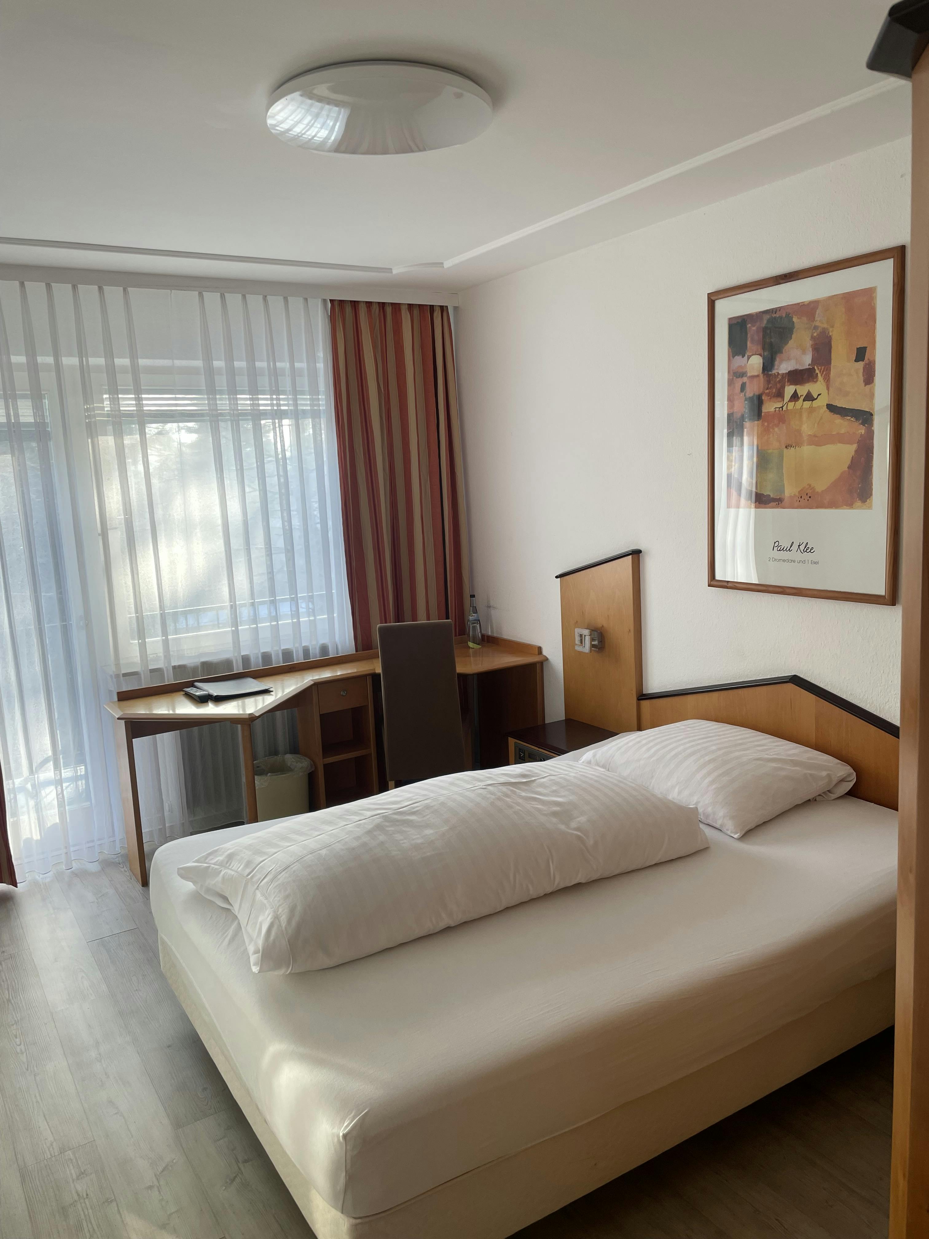 The single room is furnished with a French bed measuring 1.40 metres in width and has a balcony. There is also a desk, a TV and a wardrobe. The room has an integrated bathroom with shower and WC. Free Wi-Fi is available to guests and a free car park at the hotel is included.
